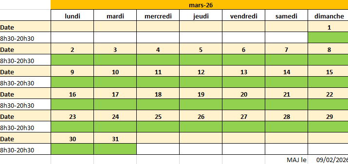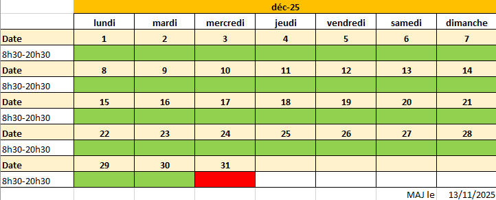 Vous trouverez ci-dessous le planning mensuel des ouvertures des urgences :