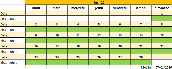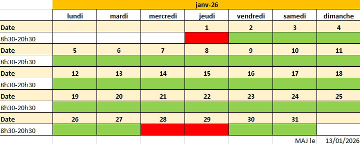 Vous trouverez ci-dessous le planning mensuel des ouvertures des urgences :